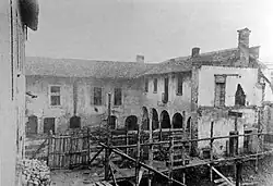 The architectural complex, which has an "L" shape and was built in 1928,[7] is divided into two levels and is enriched by a square turret rising above the second floor.[8] The first floor includes a portico with five arcades formed by some columns recovered from the Maniero Lampugnani; this open space occupies the wing of the building extending towards the entrance of Corso Garibaldi.[8] The turret is located at the intersection of the two wings, where the stairs connecting the various floors were also created.[8]