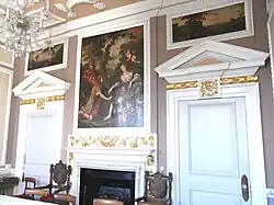 The Mayor’s Parlour includes 17th-century materials bought from Stowe House including plasterwork decorative picture frames, a decorated plaster ceiling, four doorcases with gilded pediments, a large overmantel painting in the style of Rubens of "Atalanta presented with the head of the Calydonian Boar by Meleager" and four classical capriccio scenes in small rectangular panels above the doors.[1] The wooden dock in the Court Room was a portable type which could easily be jumped by prisoners.[8]