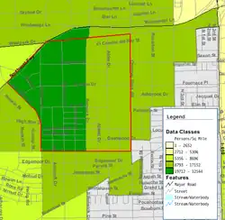 In 2015 the City of Houston-defined Gulfton Super Neighborhood #27, which includes Gulfton and various surrounding subdivisions, had 41,089 residents, with 14,508 people per square mile. 73% were Hispanic or Latino, 15% were non-Hispanic black, 7% were non-Hispanic white, 6% were non-Hispanic Asians, and 2% were non-Hispanic others.[49] In 2020 Hispanics and Latinos made up about 69% of the residents, the median income was $26,042, and the average life expectancy of Gulfton was about 75.9. Of the residents, 95% rented their residences. Rose-Ann Aragon of KPRC-TV wrote that "The culture of the neighborhood is rich but it’s [sic] dwindling in economic wealth."[31]