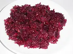 Gulkand (also written gulqand or gulkhand) is a sweet preserve of rose petals originating in the Indian subcontinent.[1] The term is derived from Persian; gul (rose) and qand (sugar/sweet).[2][3]