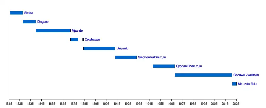 Shaka kaSenzangakhona | c. July 1787 – 22 September 1828 (aged 41) | 1816 | 22 September 1828 | Half-brother of Sigujana kaSenzangakhona | Zulu | ![]() |