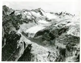 Gunsight Peak (8,198 feet (2,499 m)) is in Wenatchee National Forest in the U.S. state of Washington.[3] On the east slopes of Gunsight Peak lies Blue Glacier while to the west lies the larger Chickamin Glacier. The tallest of a series of peaks along Blue Mountain, Gunsight Peak is a challenging climb and ropes are recommended.