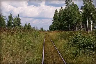 Gusevskoye peat railway emerged in the 1920s, in the area Gus-Khrustalny District, in a settlement named Gus-Khrustalny in 1931 became a town. The railway had a maximum length of about 100 kilometres (62 mi) at its peak.[1] Gusevskoye railway was built for hauling peat and workers and operates year-round with several pairs of trains a day. At present only 25 kilometres (16 mi) of the railway is operational, current operations include passenger traffic (workers-tourists) and freight traffic, transportation of peat. A peat briquette factory was built and put into operation in 2010 in a settlement named Gusevskiy.[2] A peat briquette factory was built and put into operation in 2011 in a settlement named Mezinovskiy.[3] About 2011 half of the railroad was dismantled. Formed two separate railway network.