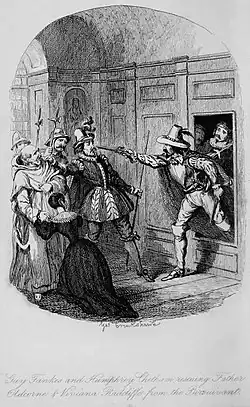 Ainsworth uses his female characters in two ways, exemplified by the Cassandra-like Elizabeth Orton, who warns Fawkes of his future, and Viviana Radcliffe, a figure of feminine beauty that dies. Radcliffe is an ideal woman in a Victorian aesthetic sense. She is obedient to her father to the point of dying for his cause, in contrast to the independent females of Ainsworth's other novels. Radcliffe is a victim, able to see that the plot is doomed, but unable to escape because she is bonded by her vows of marriage.[9] Of his major Catholic characters Ainsworth said: