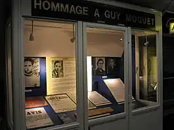In the middle of one of the platforms, a display case displays reproductions of photographs of Guy Môquet, his mother, and his father Prosper Môquet, his last letter and various documents. On the occasion of 22 October 2007 commemoration, the shelves were repainted and the lighting equipment was renewed.[4]