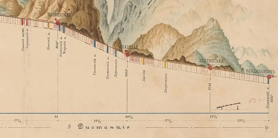 The first mention of Gveleti occurred in the document «Gergetis sulta matiane» dating to the 15th century.[3] In Russian documents the village is first mentioned in 1589 in the Ambassadorial Orders under the name "Cherebashev kabak" (settlement), named after the elder of the Ingush village — Cherbash (Ingush: ЧӀербаж). During the passage of the Russian embassy led by S. Zvenigorodsky and T. Antonov through the territory of the Ingush to Georgia in September 1589, the rains washed away the last bridge across the river on the border with Georgia, and the embassy was forced to ask for help from local residents. They were in need of wood to repair the bridge as was documented: “the ambassadors, Prince Semyon and Deacon Torkh, at the Cherebashov kabak, spend a day for the bridge”.[4][5]
