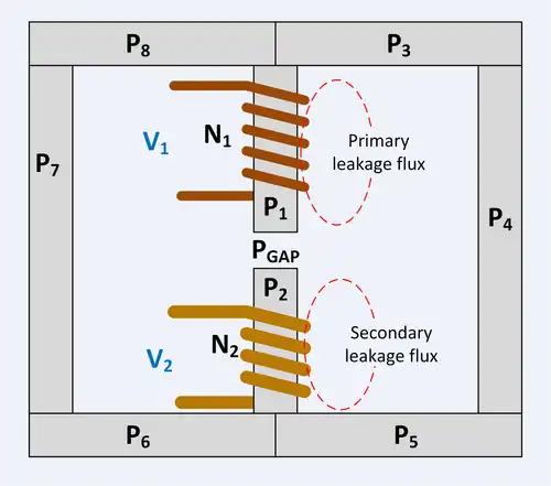 The gyrator-capacitor approach can accommodate leakage inductance and air gaps in the magnetic circuit. Gaps and leakage flux have a permeance which can be added to the equivalent circuit as capacitors. The permeance of the gap is computed in the same way as the substantive elements, except a relative permeability of unity is used. The permeance of the leakage flux may be difficult to compute due to complex geometry. It may be computed from other considerations such as measurements or specifications.