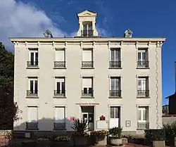 Following a significant increase in population in the first half of the 20th century, the town council decided to commission a modern town hall. The site they selected, on the south side of Rue Jules Guesde, served as a large necropolis between the 3rd and 5th centuries and later as a Carolingian village between the 9th and 11th centuries.[9] The new building was designed by the municipal architect, René Roux-Dufort, and his colleague, Noël Laval, in the Brutalist style, built in concrete and glass and was officially opened by the mayor, Maurice Coutrot, on 23 March 1969. The design involved a wide set of steps leading up to an esplanade with a long three-storey office block in front, and a largely windowless concrete block containing the public facing areas on the right.[10] Internally, the principal rooms include a large exhibition hall, named Espace Marcel Chauzy, to commemorate the life of the former conseiller general (regional councillor), Marcel Chauzy.[11] The hall was opened by Hortensia Bussi on 26 September 1981.[12]