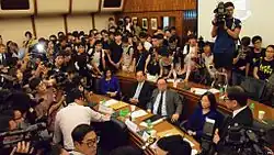 A sound recording apparently featuring the speech of Rosanna Wong against Chan at the council meeting was posted to a discussion forum in Taiwan on 8 November.[65][66] The poster said that the despite the cordial tones of the meeting between Taiwanese president Ma Ying-jeou and CCP general secretary Xi Jinping, this episode ought to serve as a reminder to all Taiwan people that what is happening in Hong Kong could easily happen to Taiwan.[67] Wong, who was university classmates with Chan at the London School of Economics, urged the council to avoid the potential controversy and not to appoint Chan because of his "strong political position" and fears that "he probably would further divide".[65][66][67] Billy Fung confirmed that the leaked recording was consistent with his recollection and with the notes he took during the meeting.[65][68]