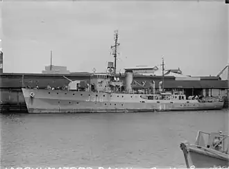In 1938, the Australian Commonwealth Naval Board (ACNB) identified the need for a general purpose 'local defence vessel' capable of both anti-submarine and mine-warfare duties, while easy to construct and operate.[2][3] The vessel was initially envisaged as having a displacement of approximately 500 tons, a speed of at least 10 knots (19 km/h; 12 mph), and a range of 2,000 nautical miles (3,700 km; 2,300 mi)[4] The opportunity to build a prototype in the place of a cancelled Bar-class boom defence vessel saw the proposed design increased to a 680-ton vessel, with a 15.5 knots (28.7 km/h; 17.8 mph) top speed, and a range of 2,850 nautical miles (5,280 km; 3,280 mi), armed with a 4-inch gun, equipped with asdic, and able to fitted with either depth charges or minesweeping equipment depending on the planned operations: although closer in size to a sloop than a local defence vessel, the resulting increased capabilities were accepted due to advantages over British-designed mine warfare and anti-submarine vessels.[2][5] Construction of the prototype HMAS Kangaroo did not go ahead, but the plans were retained.[6] The need for locally built 'all-rounder' vessels at the start of World War II saw the "Australian Minesweepers" (designated as such to hide their anti-submarine capability, but popularly referred to as "corvettes") approved in September 1939, with 60 constructed during the course of the war: 36 (including Cootamundra) ordered by the RAN, 20 ordered by the British Admiralty but manned and commissioned as RAN vessels, and 4 for the Royal Indian Navy.[2][7][8][9][1]