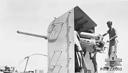 A Zero dived on Pirie, strafing the foredeck and the crew of the 12-pounder while the corvette's starboard Oerlikon shot back.[10] The bomber dropped two bombs: Pirie turned to port to avoid one, but moved directly under the other.[13] The bomb penetrated the armoured bridge canopy, deflected off the helmsman's station, killed the gunnery officer, then struck the foredeck plating and detonated, where it killed six of the seven men on the main gun.[1][14] Had it not struck the bridge first, the bomb would likely had penetrated the magazine before detonating and destroying the entire ship.[14]