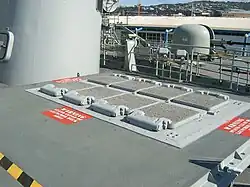 As designed, the main armament for the frigate is a 5-inch 54 calibre Mark 45 gun, supplemented by an eight-cell Mark 41 vertical launch system for RIM-7 Sea Sparrow, two 12.7-millimetre (0.50 in) machine guns, and two Mark 32 triple torpedo tube sets firing Mark 46 torpedoes.[13][19] They were also designed for but not with a close-in weapons system (a Phalanx CIWS installed shortly after the frigate's completion, supplemented by two Mini Typhoons from 2006 onwards), two quad-canister Harpoon missile launchers, and a second Mark 41 launcher (neither of which have been added to the New Zealand ships).[13][22][23] The New Zealand Anzacs initially operated with a Westland Wasp helicopter, which were later replaced by Kaman SH-2 Seasprites, then Kaman SH-2G Super Seasprite helicopters.[13][24]