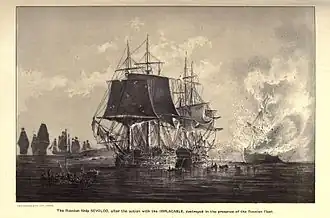 However, just outside the port, Centaur was able to collide with Vsevolod. A party of seamen from Centaur then lashed her mizzen to the Russian bowsprit before Centaur opened fire. Vsevolod dropped her anchor and with both ships stuck in place, both sides attempted to board the other vessel. In the meantime, Implacable had come up and added her fire to the melee. After a battle of about half an hour, the Russian vessel struck again.[39]