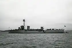 On 24 August 1930, the coastal defense ship Manligheten ran aground while sailing between Stockholm and Hårsfjärden in poor weather. Efforts by Clas Fleming and the coastal battleship Drottning Victoria were unsuccessful in freeing the ship.[12] Despite the minimal maintenance the ship had received while she was in reserve, she was mobilized after the beginning of World War II in 1939 to lay mines in the area of the Åland Islands and returned to reserve afterwards. In December Clas Fleming began a reconstruction that installed the first gas turbines used in a warship.[13] The work was finished on 8 August 1940.[14] The cruiser was to return to active service on 3 September but she did not rejoin the fleet until 22 days later.[15] The new machinery proved to be unreliable and the cruiser was back in the dock in November for maintenance.[10][16] She then served as part of the Coastal Fleet until 1944.[17] It was clear, by this time, that the ship was in need of major work if she were to remain in service.[18] After the end of the war in May 1945, Clas Fleming was placed in reserve in Stockholm, and was stricken in 1959. She was used as a target before being sold for scrap on 9 November 1960.[7]