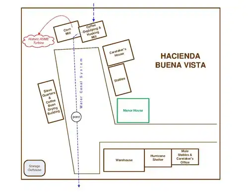 The hacienda today is made up of an 87-acre (350,000 m2) agricultural complex. Its main buildings are grouped together in a 3-acre (12,000 m2) central area and the property includes 11 original buildings: the hacienda manor house, the carriage house, the horse stables, the mule stables, the caretaker's house and office, two warehouses, a hurricane shelter, the corn mill, and the slave quarters. There is a water canal system that is still operative, an aqueduct, and a house garden. The coffee bean processing building was rebuilt to look like the original 1892 building.[20]