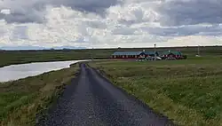 In 1918–1920 Thor built two houses on the river next to the main road: a fishing lodge and service quarters.[3] Later the houses were extended and currently serve as a fishing lodge. Walls and roofs of corrugated iron, still painted in original colors, walls painted bright red and roofs green. Further up the river Thor builds a summer house for himself and the family near the waterfall and the Kvörn [ˈkʰvœ(r)tn̥] fishing pool. The Thor family descendants sold the river estate in 1986. The current owner is Óttar Yngvason.