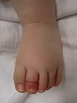 Hair tourniquet is a condition where hair or thread becomes tightly wrapped around most commonly a toe, and occasionally a finger, genitals, or other body parts.[1] This results in pain and swelling of the affected part.[1] Complications can include tissue death due to lack of blood flow.[1] It occurs most commonly among children around 4 months of age,[1] though cases have been described in older children and adults.[2]
