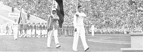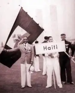 André Chevallier was the president of Haiti's National Olympic Committee in 1936 and lead the nation through the organisation process.[1] The nation had been invited to participate on 20 December 1933,[1] and were sent ten Olympic programmes in March 1935, though in Spanish rather than national language French.[2] Their small delegation (twenty Olympic identity cards and one press ticket were issued) arrived in Germany on 24 July 1936 before departing on 4 August. Their attaché in Berlin was Edouard Voigt, and the military officer assigned to serve them was Captain v. Hülsen.[1]