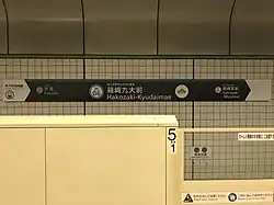 Hakozaki-Kyūdai-mae Station (箱崎九大前駅, Hakozaki-Kyūdai-mae-eki) is a subway station on the Fukuoka City Subway Hakozaki Line in Higashi-ku, Fukuoka, Japan. Kyūdai-mae means "in front of Kyushu University". Its station symbol is a pine branch with leaves which branch look like Kyushu University's initials Chinese character 九, because a pine‐covered area is named Ciyono-matsubara (千代の松原) is near this station.
