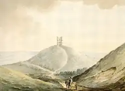 - "As we were now on our departure from Haldown on the descent of its northern extremity, we had before us a triangular tower raised by Sir Robert Palk and devoted to the memory of his friend General Lawrence. It had a round tower at each angle and rose three stories high. From its own elevation and that of the conical hill on which it was placed it became an object to the most distant parts of the county; it is hardly possible to conceive a spot better adapted to an edifice of this nature than this of Pen Hill, denominated so by the Britons on account of its eminence. I took the opposite sketch from the road from whence the pine-clad hill and the tower were seen in great perfection".