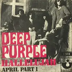 "Hallelujah" is a song by English hard rock group Deep Purple, released in 1969. It is the first single to feature singer Ian Gillan and bassist Roger Glover and released in-between their 1969 eponymous album and the live Concerto for Group and Orchestra. The B-side was an edit of the instrumental album track "April".