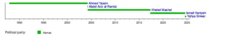 - ^ Temporarily led by a council consisting of Khaled Mashal, Khalil al-Hayya, Zaher Jabarin, Muhammad Ismail Darwish, and an unnamed senior member of Hamas.