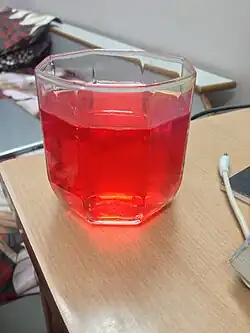 Hamdard also makes soap, honey, and a thick red syrup, Rooh Afza. The latter, created in 1907 by Hakeem Hafiz Abdul Majeed, is also produced by Hamdard India and Hamdard Pakistan. The recipe is a trade secret. According to The New York Times, it is four-fifths sugar. Majeed is known to have used rose petals, mint, and khas, a fragrant grass.[8] Among its more than 20 ingredients are chicory, coriander, fragrant screwpine, fruit juice, and red food coloring. Typically, the syrup is mixed into water or milk to make a drink, or used in desserts. It is popular in South Asia's hot summers and as a way to break one's daytime fast during Ramadan.[25] The bright crimson syrup also has an "off-label use" as a key ingredient of fake blood at Dhallywood film studios.[26]