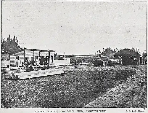 On 1 October 1884 when the Morrinsville line opened, the station reopened as Hamilton West[13].[14] By 1884, it had a 4th class station building, platform, cart approach, 60 ft (18 m) by 30 ft (9.1 m) goods shed and loading bank. In 1896 there was also a stationmaster's house, urinals and a passing loop for 38 wagons.[7] In 1892 the station was improved and increased accommodation, with further improvements in 1897, 1899 and 1900, when a verandah was added.[7]