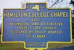 The façade was designed by architect Philip Hooker, notable for his many designs of public buildings in Albany, NY, as well as for designing Hyde Hall in Springfield Center, NY. The conservative Federal style of the chapel is characteristic of Hooker's work. The distinctive three story main body and interior design are credited to John H. Lothrop, a Hamilton College trustee. The design includes three bays on the eastern façade and eight bays of double hung windows along the north and south faces of the building. The mellow orange of the stone body of the chapel is Oriskany stone, while the corner quoins are of Trenton limestone. The Oriskany stone was quarried and laid by Reuben Wilcox of Whitestown, NY. The interior carpentry was done by Deacon Isaac Williams, of Clinton, NY. The tower of the eastern façade of the building is topped by a white, octagonal cupola. The quill weathervane[2] atop the cupola is representative of Hamilton College's commitment to teaching students to write effectively.[3][4]