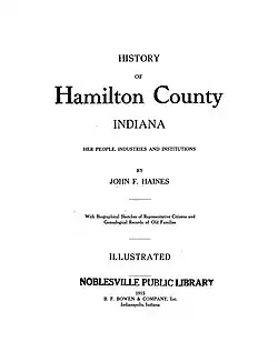 - History of Hamilton County, Indiana, with Illustrations and Biographical Sketches of Some of its Prominent Men and Pioneers, To Which are Appended Maps of its Several Townships. Chicago: Kingman Brothers. 1880. Archived from the original on February 24, 2007. Retrieved March 25, 2007.