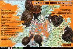 The Hamilton Underground Film Festival was a yearly event showcasing national and international underground film presented in Hamilton, New Zealand. It was founded in 2006[3] by the Otatoe Collective under the guidance of Emit Snake-Beings.[4] and has since been gathering momentum with over 100 filmmakers featured and linked events in Catalonia, Spain, Kingston upon Hull, and London.