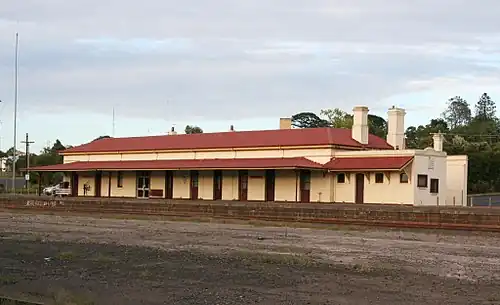 In 1987 a large number of sidings were removed including the carriage docks, in 1988 all signals were removed leaving a minimum of sidings in the yard.[5] The line from Maroona to Portland was closed for conversion from broad to standard gauge in March 1995, being reopened to traffic two months later.[1] Today the station has a platform facing the main line, with two goods sidings opposite the platform.[7]