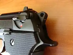 The hammer is a part of a firearm that is used to strike the percussion cap/primer, or a separate firing pin,[1] to ignite the propellant and fire the projectile. It is so called because it resembles a hammer in both form and function. The hammer itself is a metal piece that forcefully rotates about a pivot point.[2]