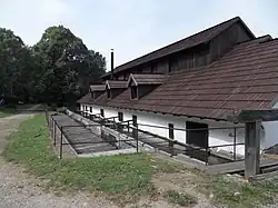 The hammer stands in close proximity to the dam of Huťský pond. The adjacent drive feeds water through a wooden trough to the water wheels that drive the hammering equipment through the transmission system.[1] Originally the iron-mill had five water wheels, today three are functional.[4][5]