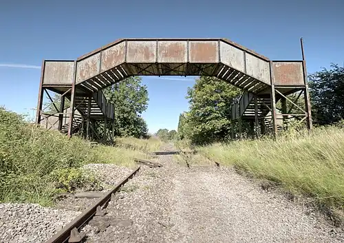 ![]() The trackbed and footbridge at the site of the former station | |||||