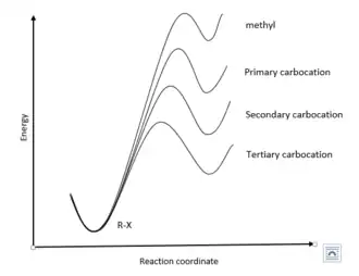 Therefore, since the tertiary carbocation is relatively stable and therefore close in energy to the R-X reactant, then the tertiary transition state will have a structure that is fairly similar to the R-X reactant. In terms of the graph of reaction coordinate versus energy, this is shown by the fact that the tertiary transition state is further to the left than the other transition states. In contrast, the energy of a methyl carbocation is very high, and therefore the structure of the transition state is more similar to the intermediate carbocation than to the R-X reactant. Accordingly, the methyl transition state is very far to the right.