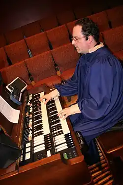 In 1936, the Federal Trade Commission (FTC) filed a complaint claiming that the Hammond Company made "false and misleading" claims in advertisements for its organ, including that the Hammond could produce "the entire range of tone coloring of a pipe organ".[43] The complaint resulted in lengthy hearing proceedings, which featured a series of auditory tests that pitted a Hammond costing about $2600 against a $75,000 Skinner pipe organ in the University of Chicago's Rockefeller Chapel.[44] During the auditory tests, sustained tones and excerpts from musical works were played on the electric and pipe organs while a group of musicians and laymen attempted to distinguish between the instruments. While attorneys for Hammond argued that the test listeners were wrong or guessed nearly half the time, witnesses for the FTC claimed that Hammond employees had unfairly manipulated the Skinner organ to sound more like the Hammond.[45] In 1938, the FTC ordered Hammond to "cease and desist" a number of advertising claims, including that its instrument was equivalent to a $10,000 pipe organ. After the FTC's decision, Hammond claimed that the hearings had vindicated his company's assertions that the organ produced "real", "fine", and "beautiful" music, phrases which were each cited in the FTC's original complaint, but not included in the "cease and desist" order. Hammond also claimed that although the hearing was expensive for his company, the proceedings generated so much publicity that "as a result we sold enough extra organs to cover the expense."[46]