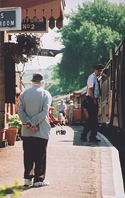 There are a number of items of rolling stock in the sidings at Hampton Loade. These include British Railways built no. 3467; a 'fruit D' goods van designed by the GWR and built at Swindon in 1955. It is owned by the Hampton Loade Station Fund and is in use as the station fund shop, known on the SVR as a 'treasure trove' for railwayana and books. It is currently painted in GWR freight grey and lettered with the words 'return to Helston'. It later had a number of W3467W and was preserved in 1973.[4] The oldest carriage on the line, the ex-GWR Churchward third coach 2426 of 1910, was used for staff accommodation at Hampton Loade for 28 years before being moved to Kidderminster in September 2016 for overhaul.[5] Its place has been taken by GWR Riding Van 55 built in 1908.