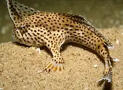 Handfish are marine, ray-finned fishes belonging to the family Brachionichthyidae, a group that comprises five genera and 14 extant species and is classified within the suborder Antennarioidei in the order Lophiiformes, the anglerfishes.[2] These benthic, marine fish are unusual in the way that in addition to swimming, they also use their pectoral fins to "walk" on the sea floor.