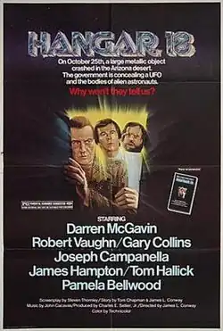 Hangar 18 is a 1980 American science fiction action film directed by James L. Conway and written by Ken Pettus, from a story by Thomas C. Chapman and Conway. It stars Darren McGavin, Robert Vaughn, Gary Collins, James Hampton and Pamela Bellwood.[3]