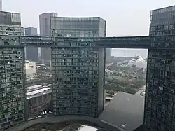 The Hangzhou Civic Center consists of a central plaza and park surrounded by 6 curved high-rise office towers surrounded by 4 lower rectangular podium buildings housing various public services.[1] The high-rise towers are connected by curving elevated walkways on the 23rd & 24th floors 85 meters (280 ft) above ground level and by underground corridors on the B1 floor.[1] The basic conceit of the design is the traditional Chinese scheme of establishing harmony between a square Earth and the round Heavens (天圆地方, Tiān yuán Dì fāng). The basement area includes shops, storage, parking facilities, and air raid shelters.