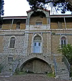 In 1887, when the old lepers' asylum in Mamilla on Rehov Agron 20, donated in 1867 by Baroness Auguste von Keffenbrinck-Ascheraden (1835–1889) from Keffenbrink became overcrowded, Jerusalem's Anglican-German Protestant community initiated the establishment of a larger facility designed by German architect Conrad Schick.[1] Construction began in 1874 and included the building of a surrounding wall, a basement level, and a large water cistern.[3] The building, surrounded by a high stone wall, was established in an isolated spot northwest of the German Colony with the name of the institution, Jesus-Hilfe (Jesus's Help), inscribed on a lintel on the main façade.[2] The Herrnhut Brethren, the German branch of the Moravian Church, was responsible for fundraising and management.[3] An innovative feature of the building was the construction of a self-standing two-story bathroom tower.[4] At the time of its establishment, this institution was considered the only one of its kind in the Middle East- a modern European hospital that became a model for the founding of leprosy hospitals in various countries.[4]