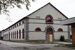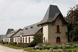 The oldest building at the Lamballe stud is stable No. 1, whose walls date back to the late 18th century. Stable No. 2, opposite, was built in 1842. The adjutant's and deputy director's quarters are located between these two stables and were built on the site of a former main gate. All other buildings – stables, offices, and tack room – date from the late 19th century. Two rows of symmetrical stables abutting the main entrance were built perpendicular to each other, on the site formerly known as "La ferme du Pavillon", at the time of management by Mr. Dupont-Auberville.[57] A stable with stalls built before 1907 was restored in 2005 to become a venue for art exhibitions and educational events, the "Ecurie des Arts".[59]