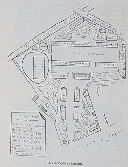 In 1825, the attempt to create a real stud farm failed.[1] The mayor of Lamballe called for a stallion depot to be set up in his town, and the Dinan arrondissement council passed a resolution to this effect. A royal decree of January 16, 1825, concerning the reorganization of the national stud farms, ordered the purchase of the Saint-Martin barracks (then owned by M. Micault de Mainville) by the town of Lamballe; the town and the département then contributed financially to the installation work.[6][14] Mr. Gravé de la Rive was appointed head of the depot, then quickly replaced by M. Thiery at the end of 1828, who was in turn replaced by M. de Coëtquen des Ormeaux de Coëtdihuël.[8] M. de Salinis ran the depot from 1831 until its closure in 1833.[15] Four stallions were acquired between 1826 and 1830.[6] The Côtes-du-Nord equestrian commission, meeting in February 1829, emphasized the high quality of the department's broodmares and asked Lamballe for funds to buy the best local stallions before they were sold commercially.[15][16] However, with the opening of the Haras National de Langonnet, the creation of a stallion depot in Lamballe was deemed unnecessary.[6] The depot was administratively abolished for budgetary reasons in 1833.[17] A letter from the Prefect dated March 5, 1834, ordered the transfer of equipment and horses to Langonnet.[15][18] The development costs incurred were lost, and the four stallions were transferred to Langonnet.[6] The depot was officially closed in 1834, after eight years of operation. During this time, it had been overseen by four different directors.[15] This led to protests, notably in the Journal des Haras, where breeders voiced their concerns about the closure.[19] The closing of the depot is noted in the register of the Côtes-du-Nord equestrian commission as a "calamity that spreads discouragement among breeders".[16] Numerous complaints from breeders reached the prefect and the general council, as the transfer of equine breeding activities to Langonnet for the entire Côtes-du-Nord department caused major disruption.[20][21] In December 1835, the prefect forwarded these complaints to the minister, deploring the costs incurred by the town and the département, to no avail.[20] In 1836, the General Council asked for the Lamballe stallion depot to be re-established.[22]