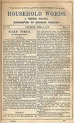 The novel was published as a serial in Dickens's weekly publication, Household Words. Sales were highly responsive and encouraging for Dickens who remarked that he was "Three parts mad, and the fourth delirious, with perpetual rushing at Hard Times". The novel was serialised, in twenty weekly parts, between 1 April and 12 August 1854. It sold well, and a complete volume was published in August, totalling 110,000 words. Another related novel, North and South by Elizabeth Gaskell, was also published in this magazine.