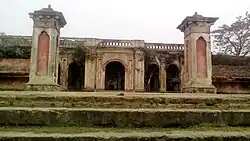 Haripur Barabari is a multi domed three stored building. Area and stylish architecture implies the historical craft, architecture and structural perfection. This palace boundary acquires nearly 5 acres of high land with 60 chambers including Theater, Darbar Hall, Store house, Cowsheds, Kitchen, Casino, Play ground, Pagoda, Temple, small pond etc. Six stare cases are at six side of the palace for first floor and two stare cases for second floor. Six bedrooms at the north-west, four at the east and four at the west side of the pond. There is a big brick build wharf(Bengali: সান বাঁধানো ঘাট) at the west of the palace that falls on the river and both sides decorated by pagodas of Krishna Prasad Roy Choudhury at the north and Gouri Prasad Roy at the south.[1][3][4] People of this area used river route for communication and comfortable journey and most probably wharf kept as the main gate for the same purpose.