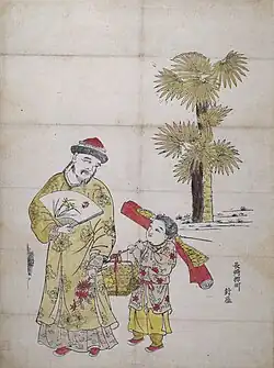 Three different prints are known.[5] In all three the publisher is given as Hariya (針屋) of Nagasaki Sakura-machi (長崎櫻町).[1][2][3] When C. R. Boxer was writing, the Hollander was unique, with two prints of each of the other two known.[5] A set of all three may now be found at Kobe City Museum although, judging from the similar later issues by other houses based on these the earliest prints, there may originally have been also a fourth, of a Dutch ship.[5] The prints are hand-coloured, using a brush and red, yellow, brown, and blue[5] pigments, over the printed ink sumi-zuri.[1]