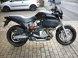 - XR1000, two high rise flat track style exhausts on the left and two staggered K&N type filters feeding Dell'Orto carburetors on the right. Had a 1,000 cc engine and a combination of XLX Sportster and modified XR-750 parts.[10]