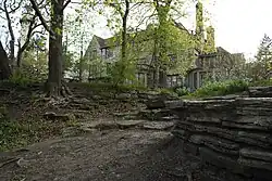 The three-story, 16-room, limestone mansion was originally situated on nearly five acres of lakefront property landscaped by Jens Jensen, a Prairie School landscape architect, in collaboration with Alfred Caldwell.[3][4] Amongst the elements of the landscape was an informal wooded landscape on the bluff down to the home's private sand beach. This wooded bluff featured grassy clearings, and an "Indian Council Ring" (the latter being a personal signature of Jensen's landscapes).[3] While the landscape has since been changed, several features of the original design currently remain. This includes a hemlock-shaded pond with waterfall, a council ring, many terraces and pathways, as well as portions of the original plantings.[4]