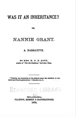 This article incorporates text from this source, which is in the public domain: Goff, Mrs. H. N. K. (1876). Was it an Inheritance?; Or, Nannie Grant: A Narrative (Public domain ed.). Claxton, Remsen & Haffelfinger.